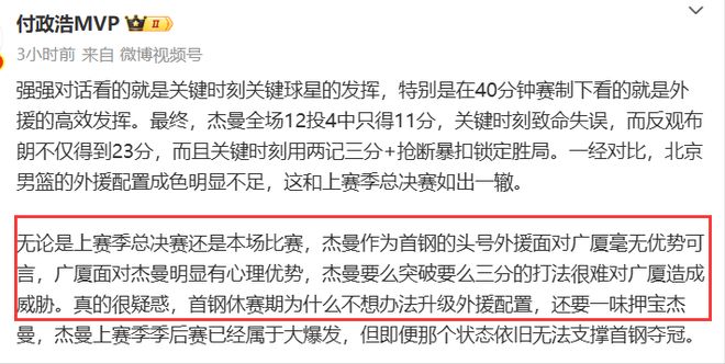 付政浩在賽後也發表長文批評了傑曼:無論是上賽季總決賽還是本場比賽,傑曼作為首鋼的頭號外援麵對廣廈毫無優勢可言,廣廈麵對傑曼明顯有心理優勢,傑曼要麽突破要麽三分的打法很難對廣廈造成威脅。