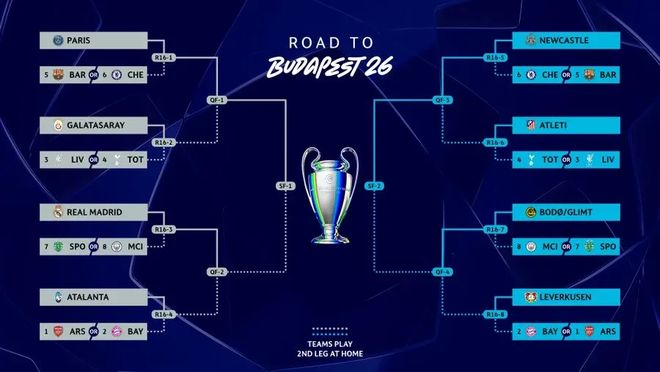 本賽季歐冠16強格局,英超斷崖式領先,歐陸四大聯賽隻有西甲保持常勢三強晉級,德甲兩隊(拜仁、勒沃庫森)緊隨其後,意甲與法甲各自僅有一隊入圍。英超一家聯賽的16強球隊數量,幾乎匹敵其餘四大聯賽。而且英超6隊有5隊是聯賽階段直接晉級,唯一參加淘汰賽附加賽的紐卡斯爾聯也簽運上佳,輕鬆擊敗阿塞拜疆黑馬卡拉巴赫晉級。